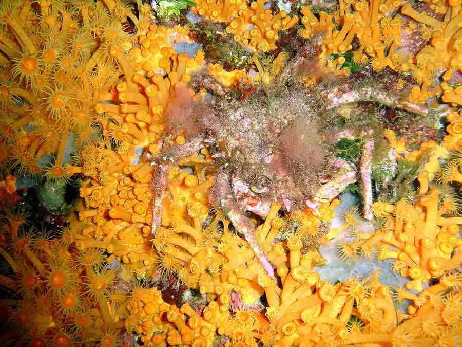 Carapace colore rosso, arancio o bruno chiaro, ricco di spine di colore bianco, con diametro fino a oltre 20 centimetri, più largo che lungo. Zampe sottili e lunghe, adatte al movimento sul fondale sabbioso. Chele anteriori piccole, punta nera o molto scura, lunghe, al termine di braccia snodate in due differenti punti, leggermente più spesse delle zampe.