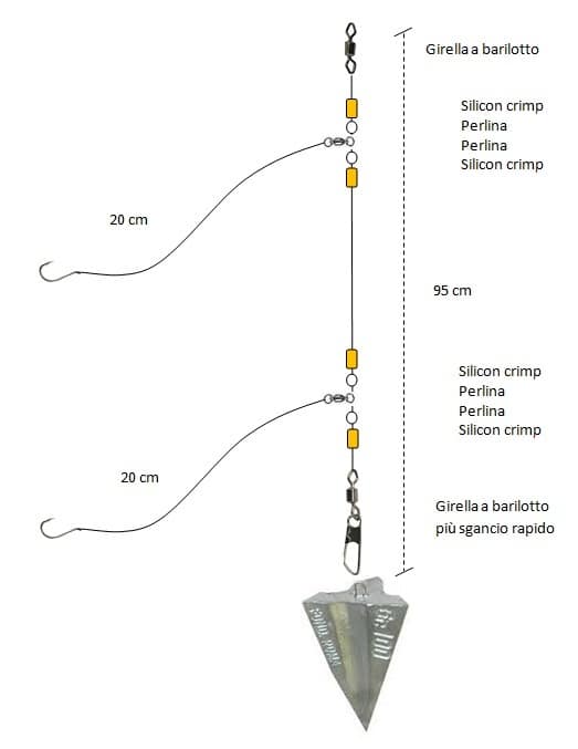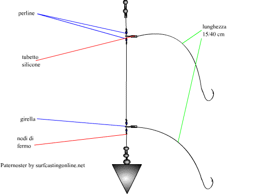 C’è da dire che, quello nel disegno, in realtà è un doppio short, ideale per la paf. Nel surf casting il terminale inferiore non deve superare il piombo in modo da scongiurare ingarbugliamenti quindi, a surf, spostiamo gli snodi più in alto. Spostando gli snodi più in alto possiamo chiamarlo paternoster.